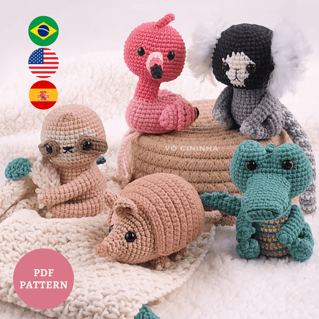 Opção completa: Arquivo em PDF em PORTUGUÊS/INGLÊS/ESPANHOL com PADRÕES para reproduzir amigurumis dos animais bicho-preguiça, flamingo-americano, jacaré-do-papo-amarelo, sagui-de-tufos-brancos e tatu-galinha.