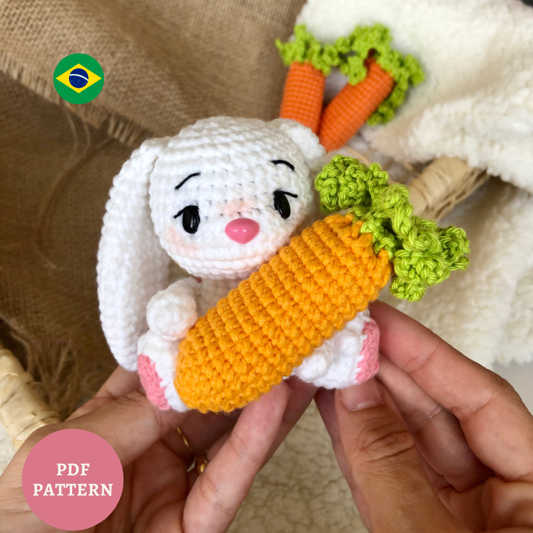 – Arquivo em PDF em PORTUGUÊS com PADRÃO para reproduzir um amigurumi de um coelhinho e uma cenourinha que cabe um BIS dentro. No PDF tem disponível lista de materiais para fazer os modelos de coelhinhos de outras cores e com fio pelúcia.