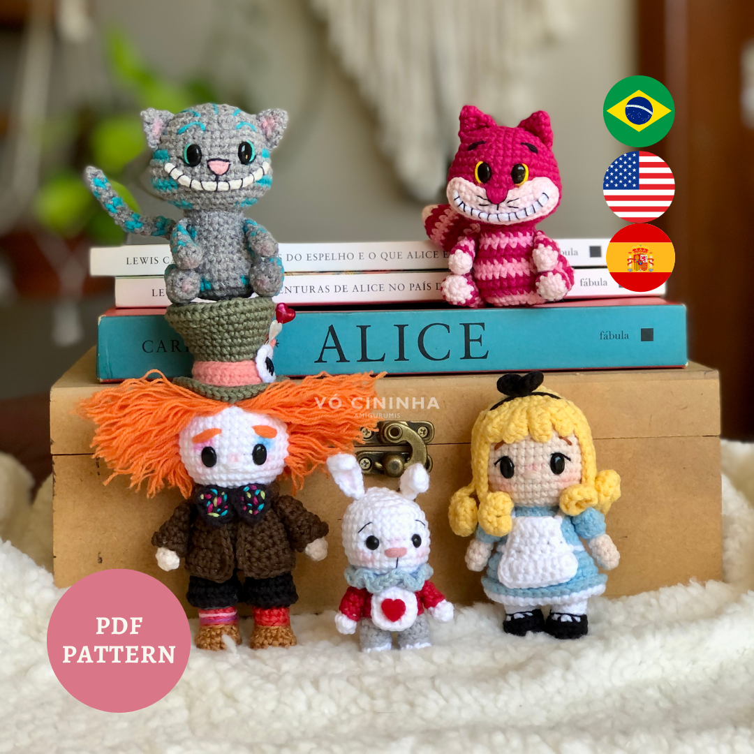 Usando o material indicado, as peças ficarão com a média de tamanho: – Chapeleiro (12,5 cm com chapéu). – Gatos de Cheshire (7 cm), Alice (9 cm), Coelho (5,5 cm).